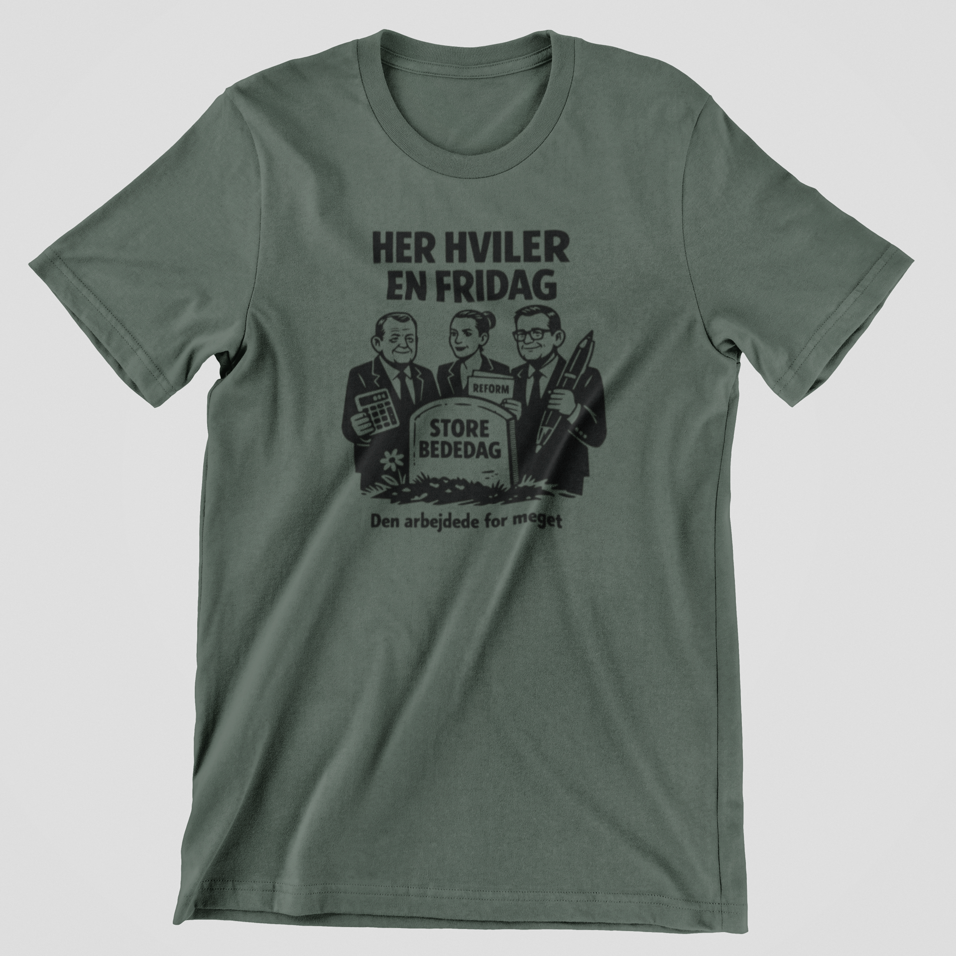 Vis din holdning med humor og kant. Denne unikke t-shirt med teksten “her hviler en fridag – den arbejde for meget” er en kreativ og satirisk kommentar til afskaffelsen af Store Bededag. Motivet symboliserer modstanden mod beslutningen om at fjerne den traditionsrige helligdag og taler direkte ind i den danske debat om arbejdsliv, fritid og balance.