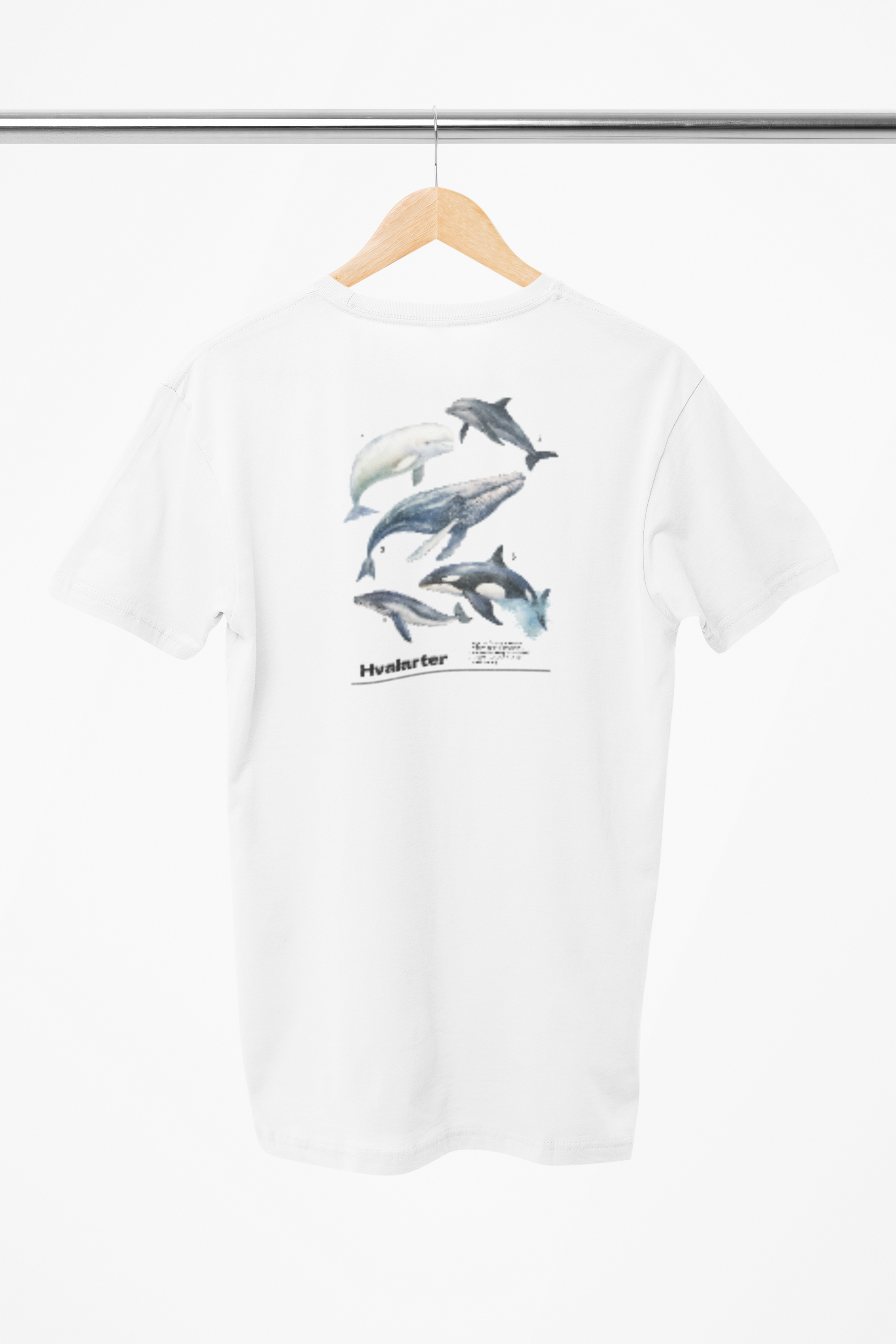 Tag havets vidundere med ind i din garderobe med vores t-shirt, der viser en samling af forskellige flotte hvaler. Motivet hylder de majestætiske kæmper i havet – fra den mægtige blåhval til den elegante pukkelhval og den legesyge delfin – gengivet i et detaljeret og kunstnerisk design, der fanger havets mystik og storhed.