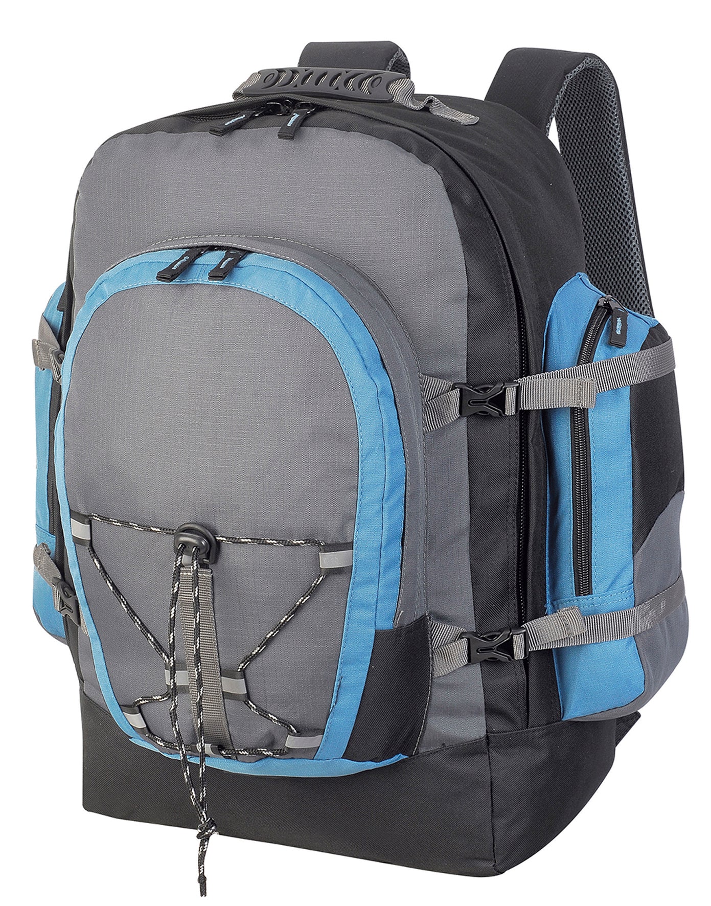 En robust og rummelig vandre og rejserygsæk i slidstærkt rip-stop polyester. Den har et polstret bagpanel og justerbare skulderstropper for optimal komfort, samt bærehåndtag til nem transport. Rygsækken har et hovedrum med lynlås, mindre forlomme med snøre-lukning og to store sidelommer med lynlås. Brystremmen sikrer stabilitet under transport – perfekt til både hverdag og rejser.