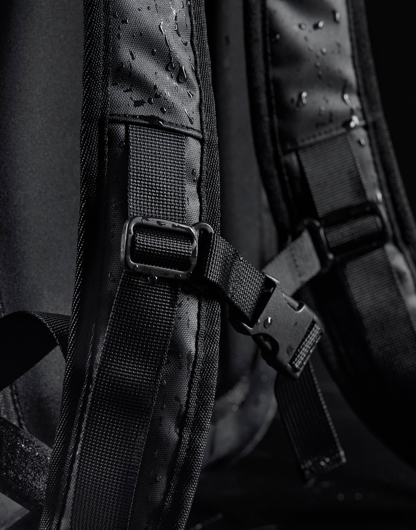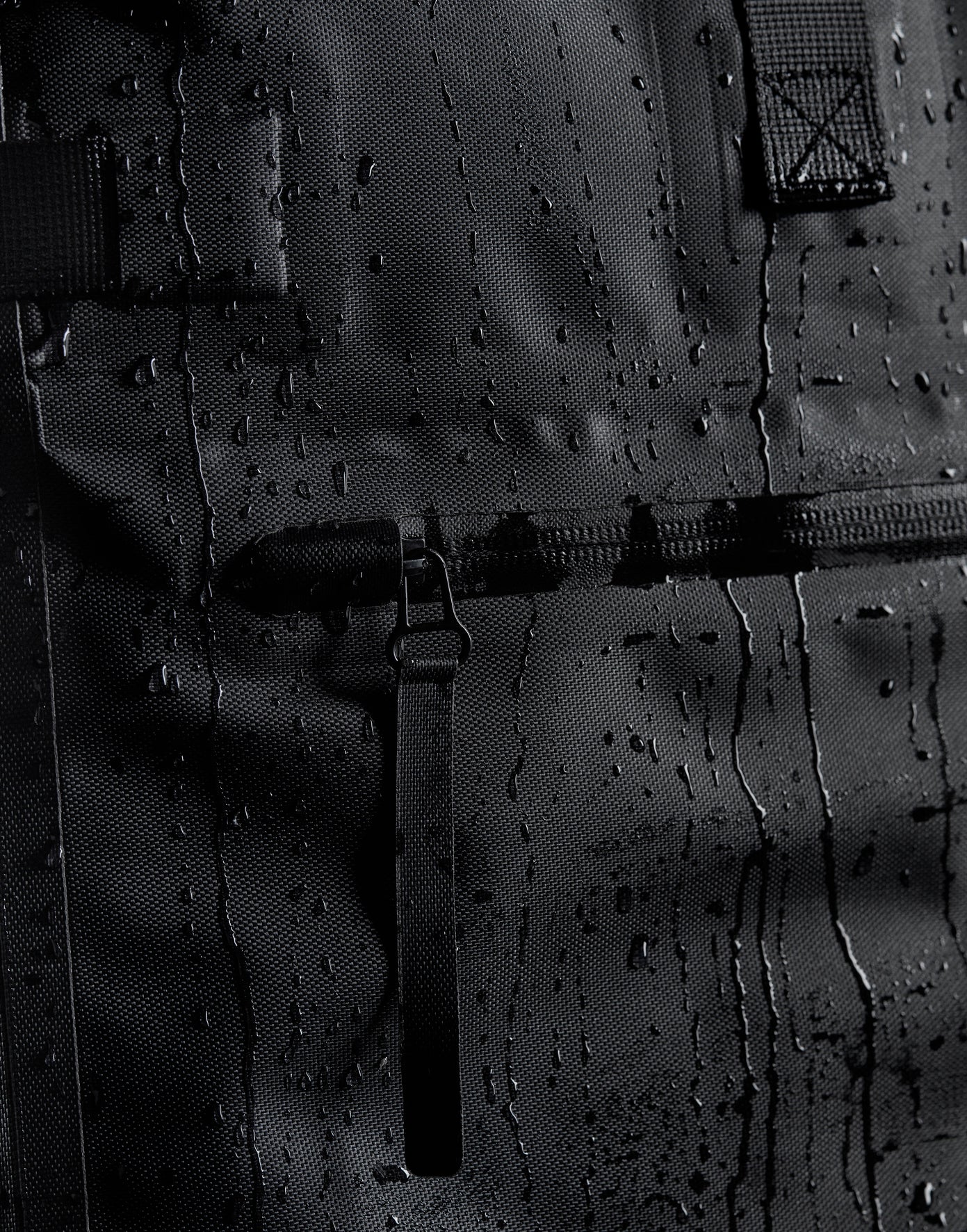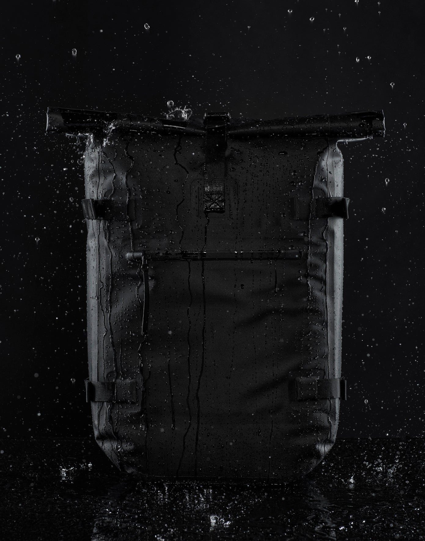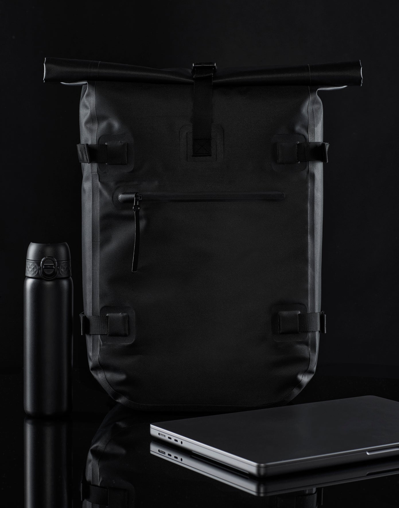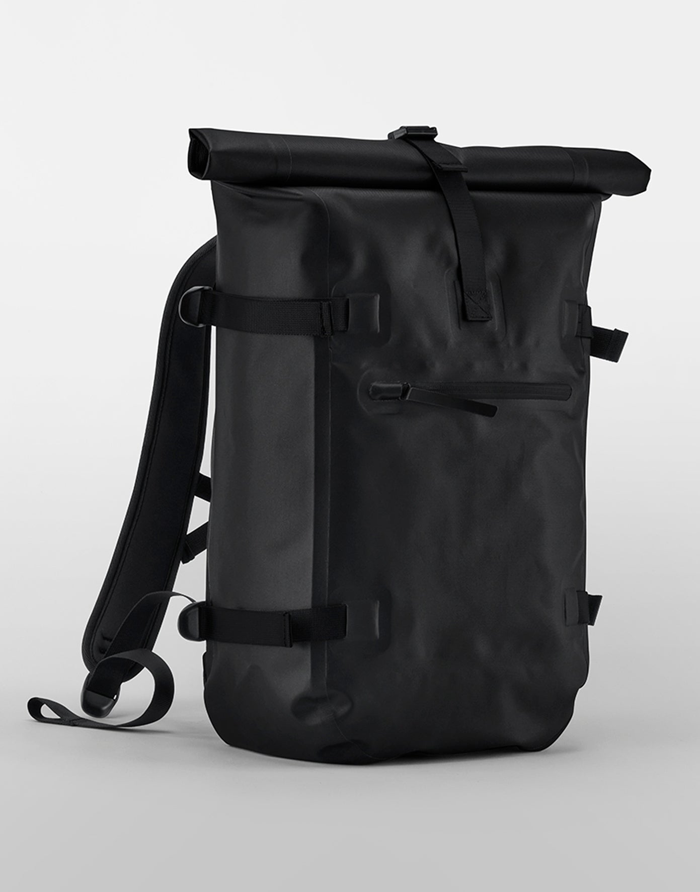 Vandtæt roll-top rygsæk fremstillet af 100% genanvendt polyester (600D) med PU-belægning foran og TPU-belægning bagpå for maksimal vandtæthed. Rygsækken har polstrede, justerbare skulderstropper, roll-top lukning, og et vandtæt hovedrum.